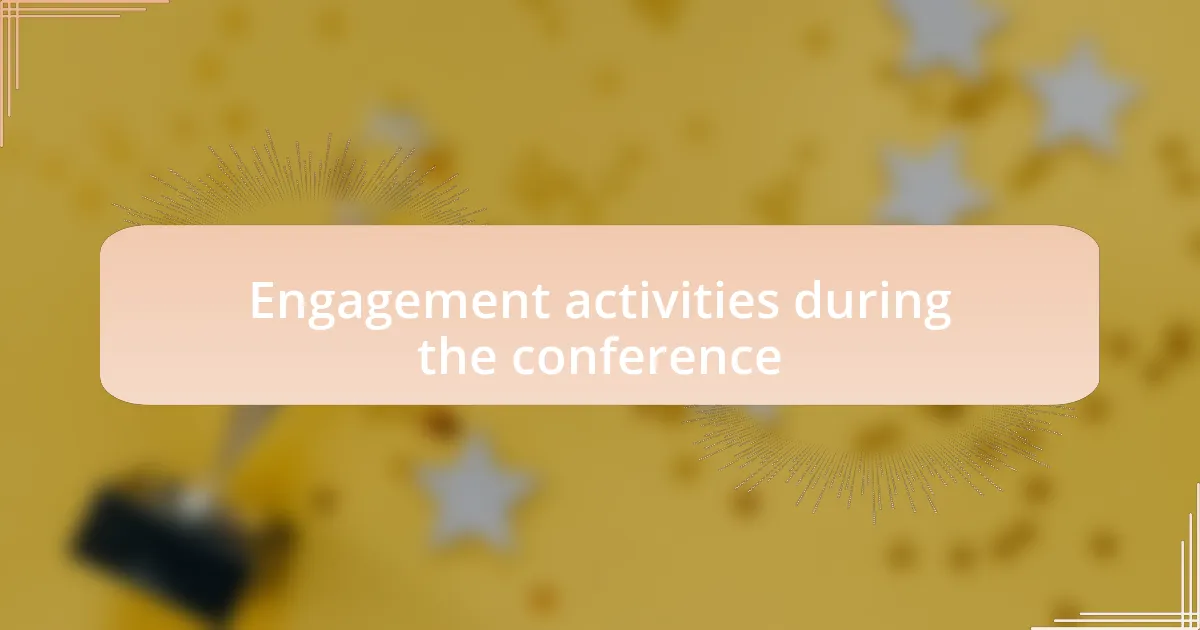 One of the highlight engagement activities during the conference was the interactive workshop on mindfulness and user modeling. Participants were invited to practice mindfulness techniques in real-time, fostering an environment of openness and calm. I couldn’t help but notice how such activities not only provided immediate relief but also sparked conversations on incorporating mindfulness into user experience design. Isn’t it fascinating how a simple breathing exercise can lead to profound discussions on mental health?